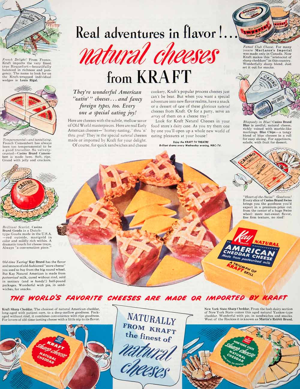 This is an original 1951 color print ad for "Kraft Natural Cheeses." Featured are such cheeses as: Louis Rigal, Casino Brand Camembert, Casino Brand Gouda, Kay Brand, Kraft Sharp Cheddar, New York State Sharp Cheddar, Casino Brand Swiss, Casino Brand Blue, Blue Chips, and MacLaren's Imperial. The ad also invites you to enjoy the Kraft TV Theatre and gives day and time of the drama.