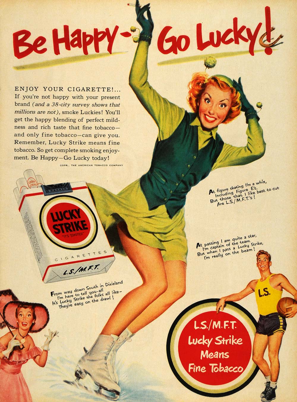 Keywords specific to this image: Vintage Advertising, basketball player, woman smoking, ice skating