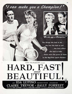 This is an original 1951 black and white print ad for the movie "Hard, Fast and Beautiful" starring Claire Trevor and Sally Forrest. It was produced and directed by Ida Lupino and Collier Young as well as having a screenplay written by Martha Wilerson.
