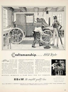 This is an original 1951 black and white print ad for industrial bolts, nuts, screws, and rivets that were made and sold by the Russell, Burdsall & Ward Bolt and Nut Company (RB&W) of Port Chester, New York (NY). The ad also features an illustration of a Brougham horse-drawn carriage from the 19th century.