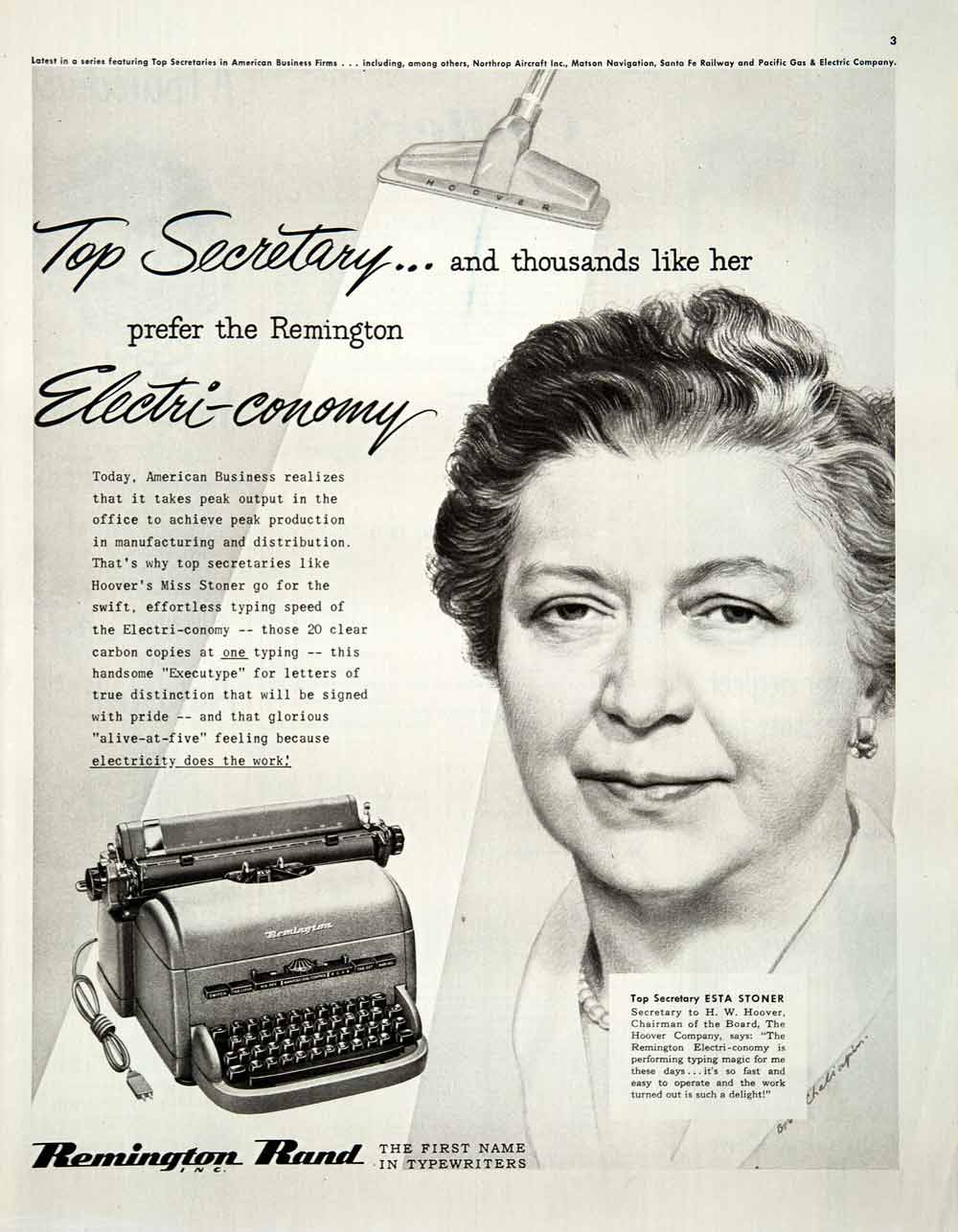 This is an original 1951 black and white print ad for the Electric-conomy typewriter by Remington Rand Typewriters.