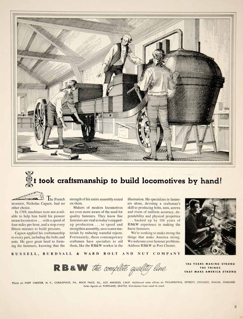 This is an original 1951 black and white print ad for industrial fasteners that were made and sold by the Russell, Burdsall & Ward Bolt and Nut Company (RB&W) of Port Chester, New York (NY). The ad also features an illustration that depicts French inventor Nicolas-Joseph Cugnot (1725-1804) building his three-wheeled fardier à vapeur or "steam dray" that was used by the French army to transport heavy artillery guns and cannon barrels. Cugnot's invention is argued by some historians to be the world's first automobile. Cugnot finished building his invention in 1769.