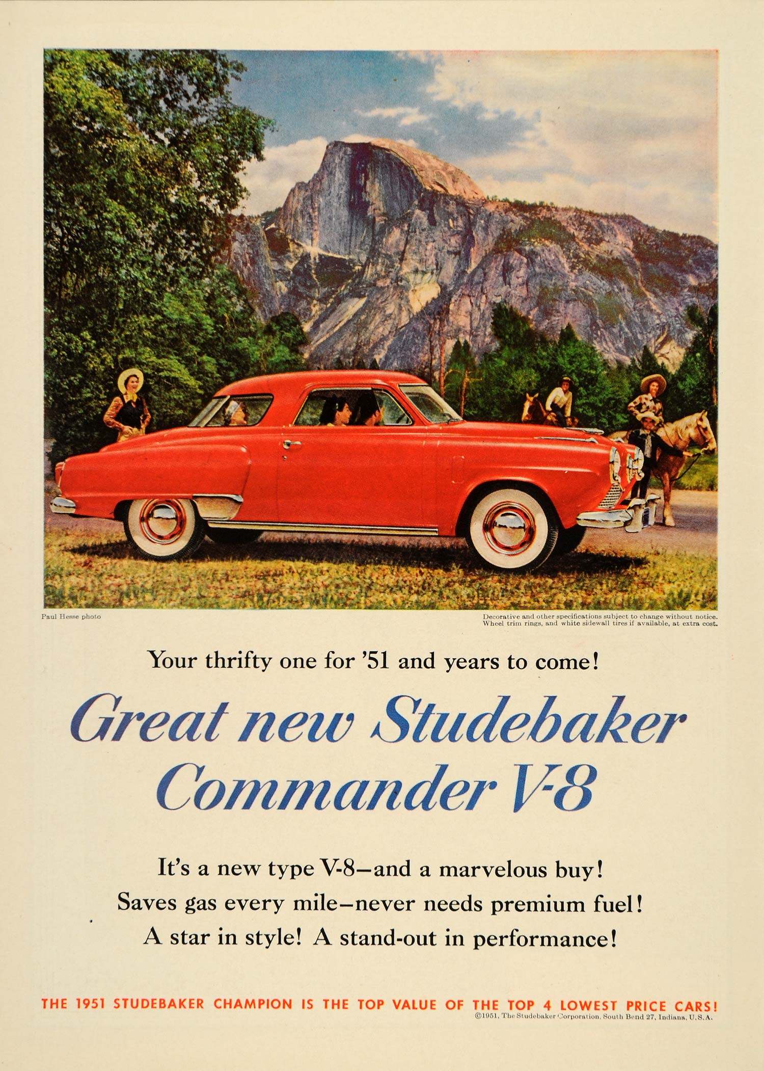 This is an original 1951 color print ad for the new Studebaker Commander V8 automobile, featuring a fantastic image by Paul Hesse of travelers taking in the authentic scenery of mountains and cowboys.