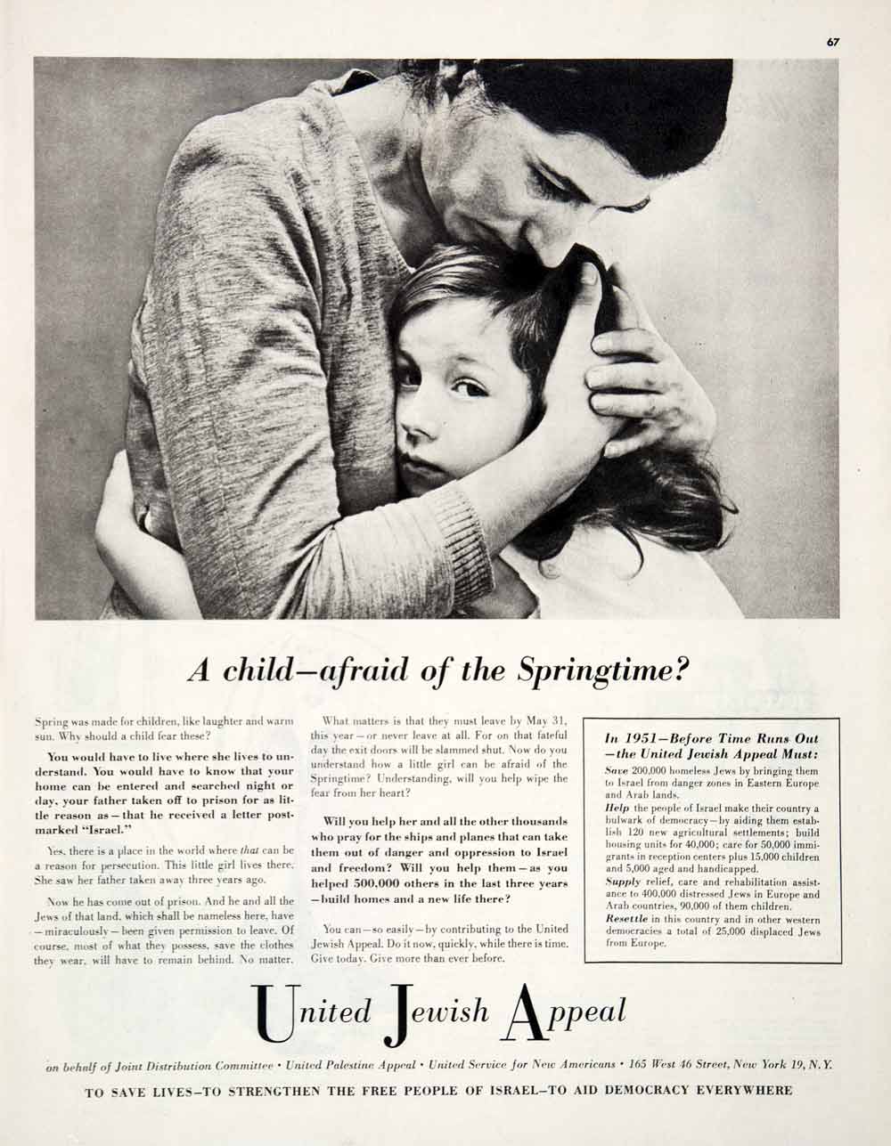 This is an original 1951 black and white print ad for the United Jewish Appeal on behalf of the Joint Distribution Committee, United Palestine Appeal, Unites Service for New Americans at 165 West 46 Street, New York.