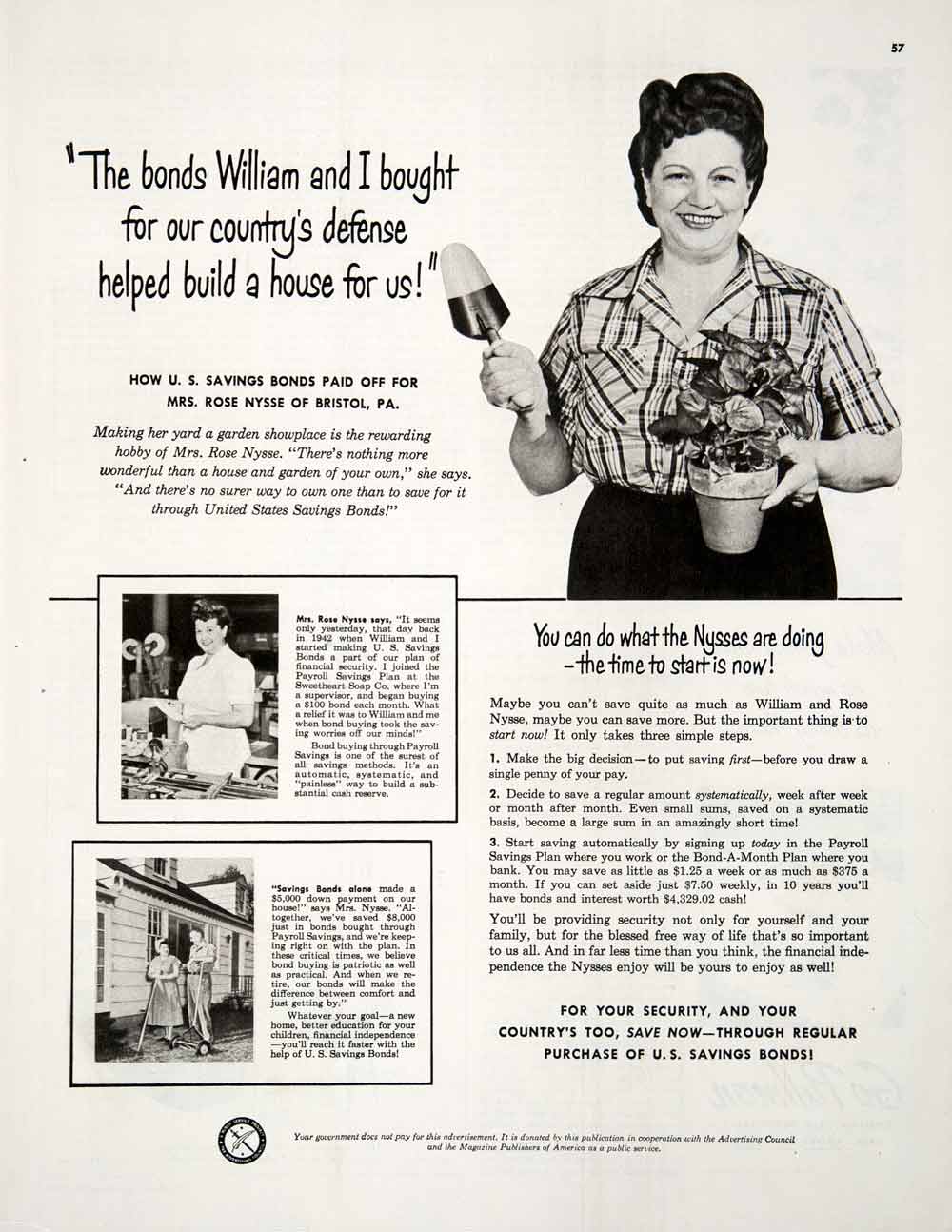 This is an original 1951 black and white print ad for "United States Savings Bonds," for your security and your country's too! It appears to be suggesting putting your green thumb to work on saving money as well and plants! Put your money where your plant is and help your country at the same time!