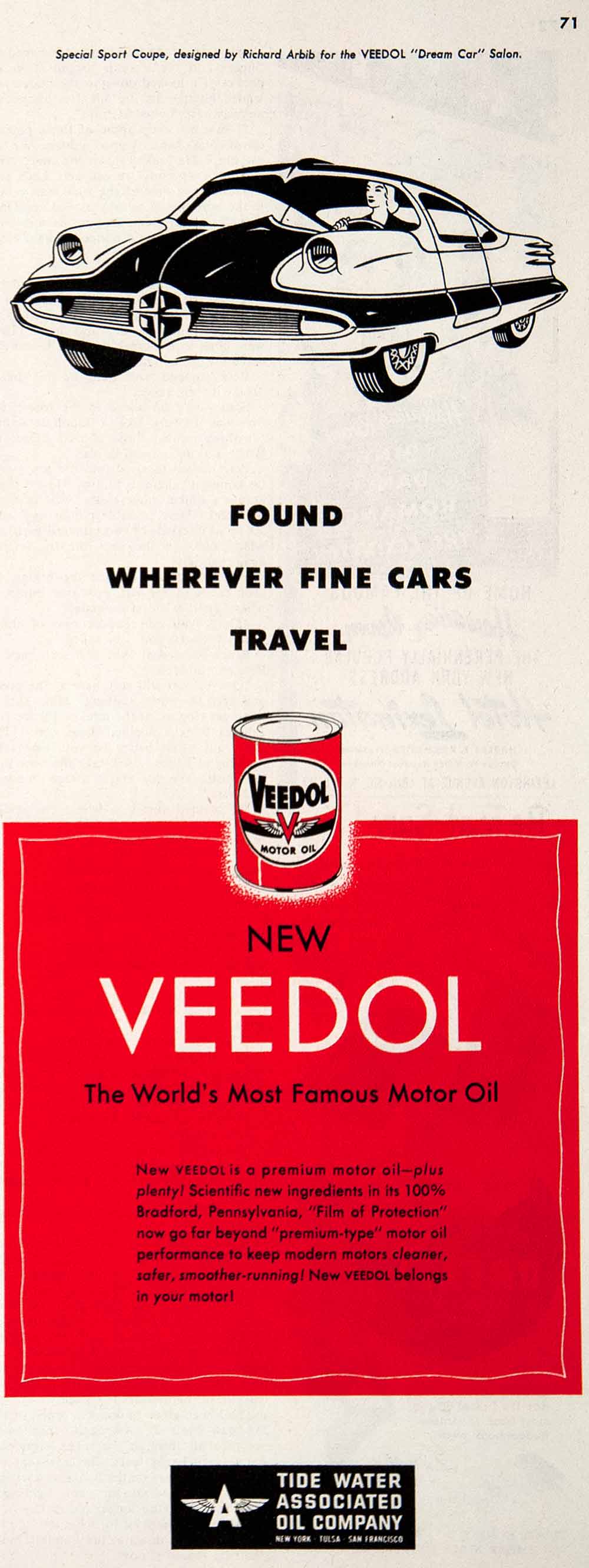 This is an original 1951 two-color print ad for "Veedol Motor Oil," from the Tide Water Associated Oil Company in New York, Tulsa, and San Francisco. Featured is Richard Arbib's 'Special Sport Coupe' which he designed for the Veedol 'Dream Car' Salon.