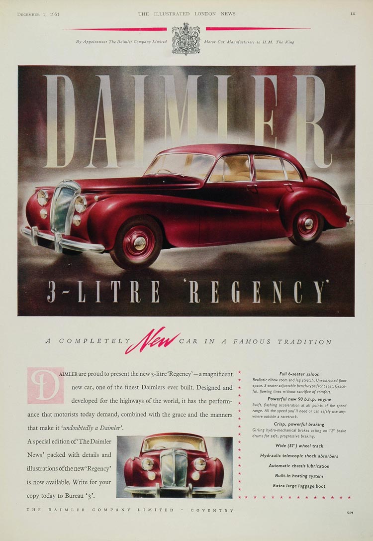 This is an original 1951 color print ad for the 3-litre, 90 h.p. Daimler Regency from the Daimler Company, Ltd., Coventry.