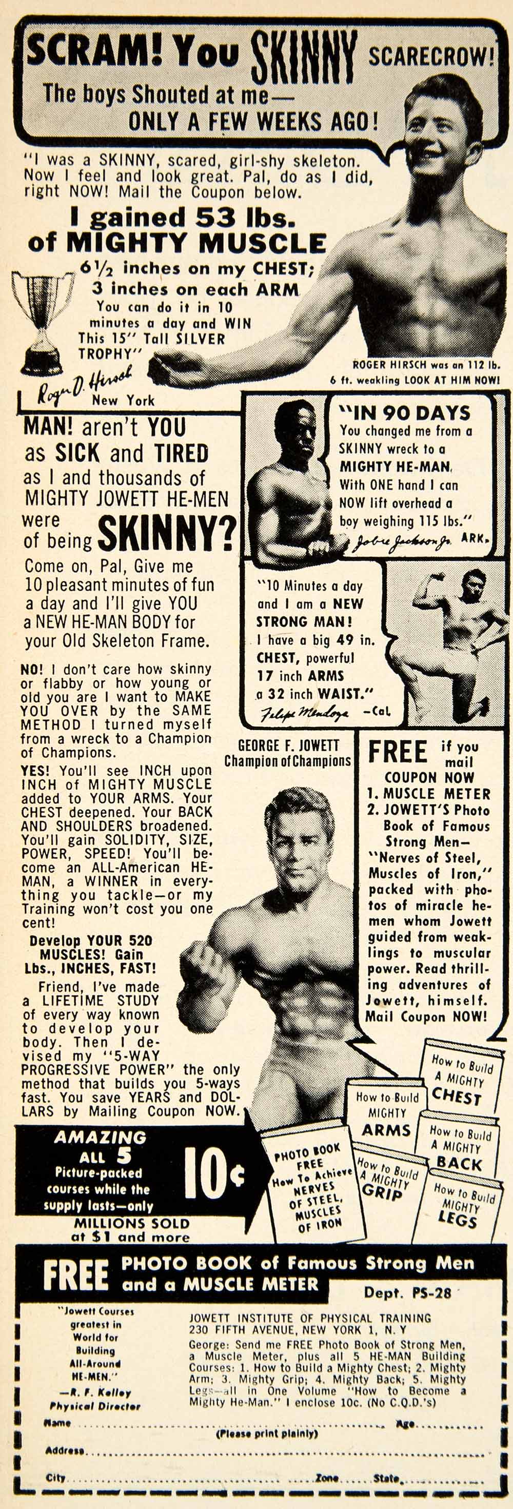 This is an original 1951 monochrome print ad for the workout routines created by the Jowett Institute of Physical Training, whose offices were located at 230 Fifth Avenue, New York.