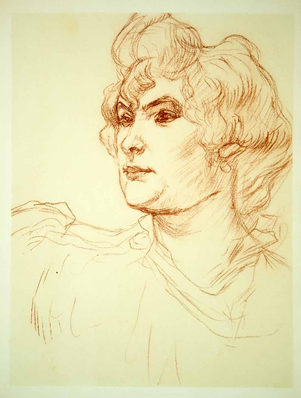 This is an original 1951 two-color lithograph of a 1898 portrait study in red chalk on tinted paper by Henri de Toulouse-Lautrec.