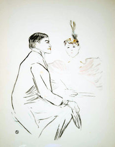 This is an original 1951 color lithograph of a 1895 china ink wash and watercolor drawing by Henri de Toulouse-Lautrec of two French actors in the play "Amants" by Maurice Donnay that was produced at the Théâtre de la Renaissance in Paris.