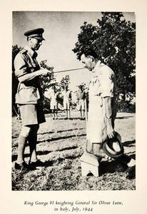 This is an original 1951 black and white photogravure of King George VI knighting military General Oliver Leese in 1944. Leese had notably served in World War II.