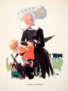 This is an original 1951 color photolithograph of the traditional costume of the city of Groningen, the Netherlands. Groningen is the capital of the province of the same name.