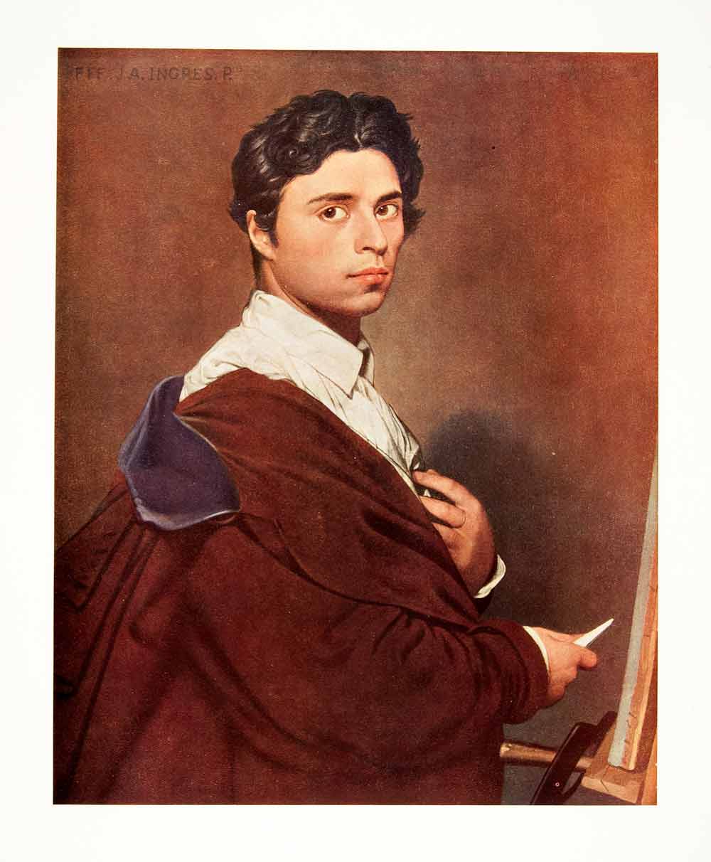 This is an original 1951 color tipped-in print of a self-portrait of the artist Jean-Auguste-Dominique Ingres (1780-1867) in 1804. Ingres was born in France and is known for his Neoclassical style paintings. He considered himself to be a painter of history, but was also known for his portraits.