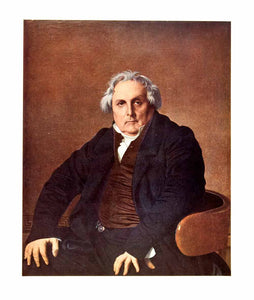This is an original 1951 color tipped-in print of a portrait of Monsieur Louis-Francois Bertin who was a writer and the director of the pro-royalist Journal des débats. The original artwork in this print was created by artist Jean-Auguste-Dominique Ingres (1780-1867) in 1832. Ingres was born in France and is known for his Neoclassical style paintings. He considered himself to be a painter of history, but was also known for his portraits.