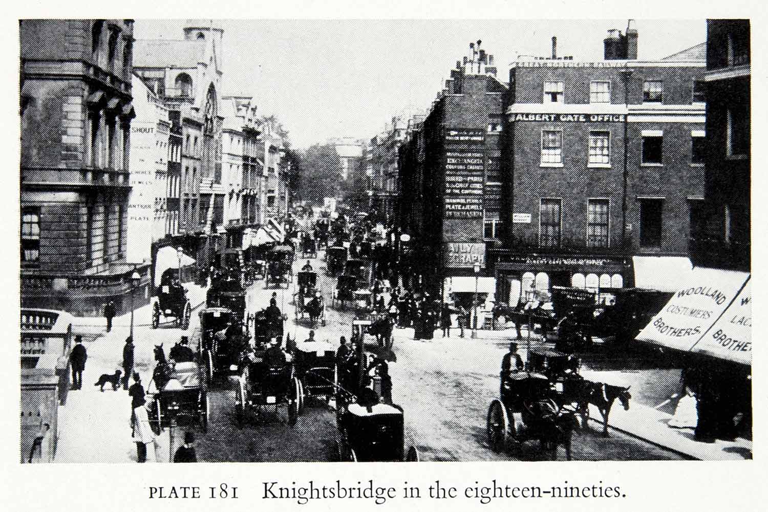 This is an original 1951 black and white halftone print of a district of London, England, called Knightsbridge. This area is south of Hyde Park.
