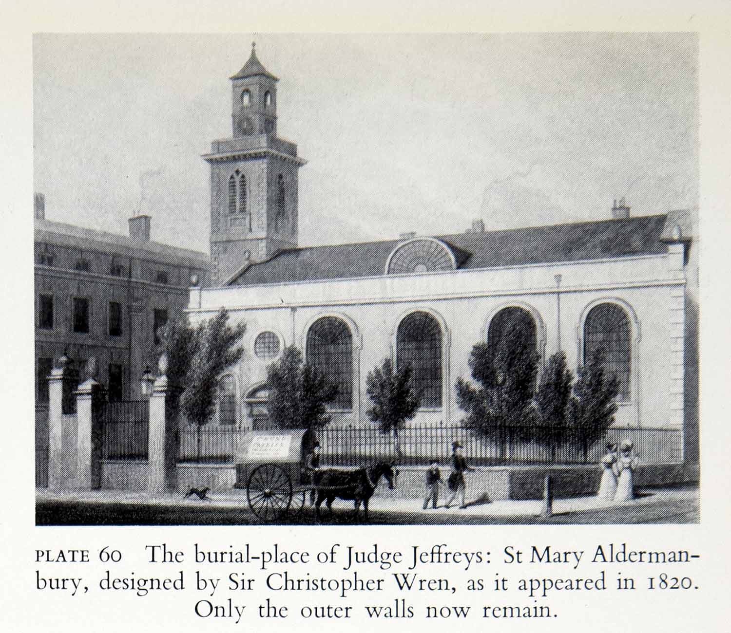 This is an original 1951 black and white halftone print of the St. Mary Aldermanbury which is a church in the City of London, England. It existed since at least 1181, but then was destroyed by the Great Fire of London in 1666. It was designed and rebuilt by Sir Christopher Wren. It was nearly destroyed again by the Blitz in 1940.