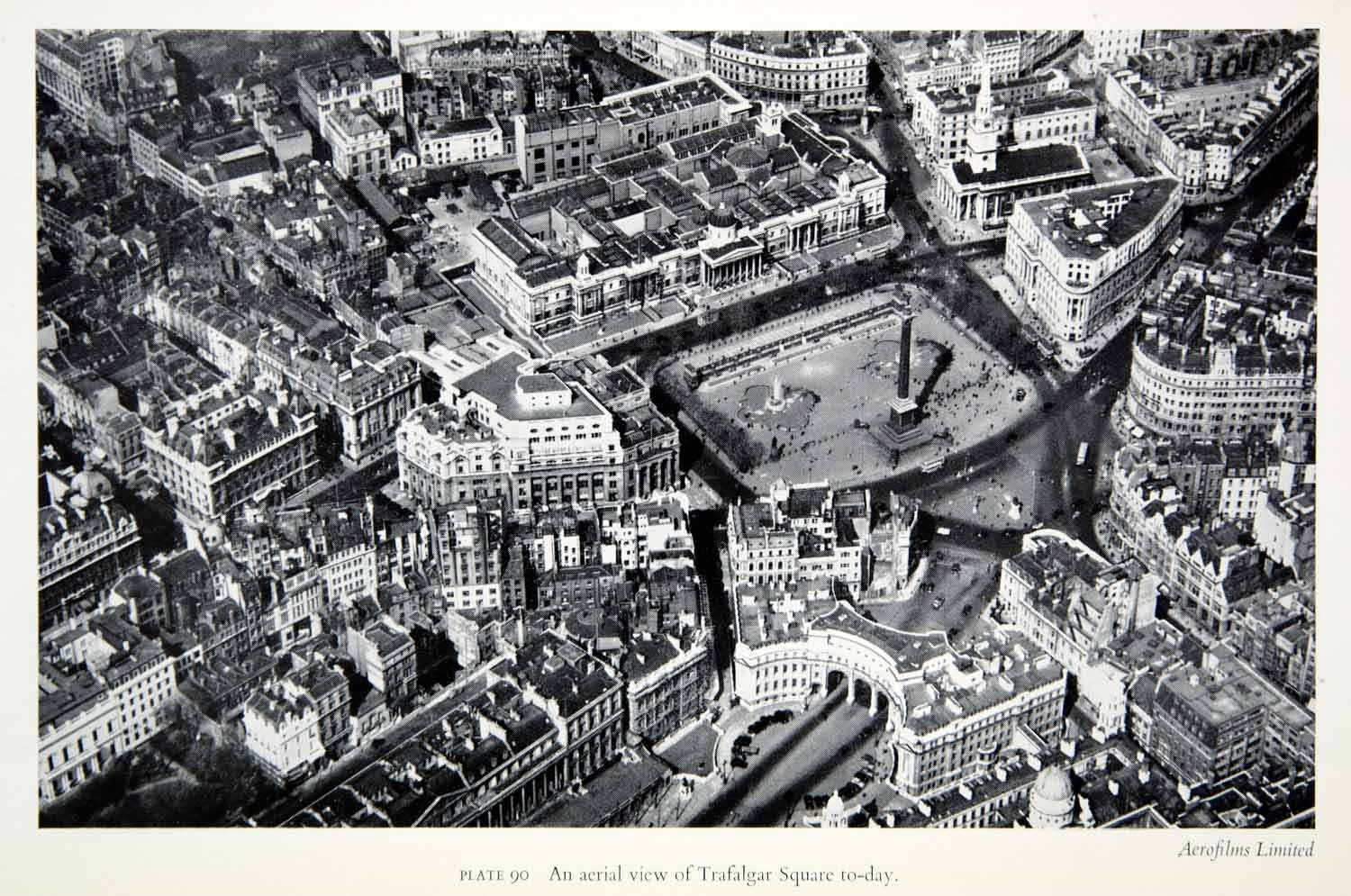 This is an original 1951 black and white halftone print of a view of Trafalgar Square in London, England. Trafalgar Square is a public space and contains Nelson's Column surrounded by lions, a fountain, and a plinth that displays contemporary art. It is located in the burough of the City of London and was built in the area formerly known as Charing Cross.