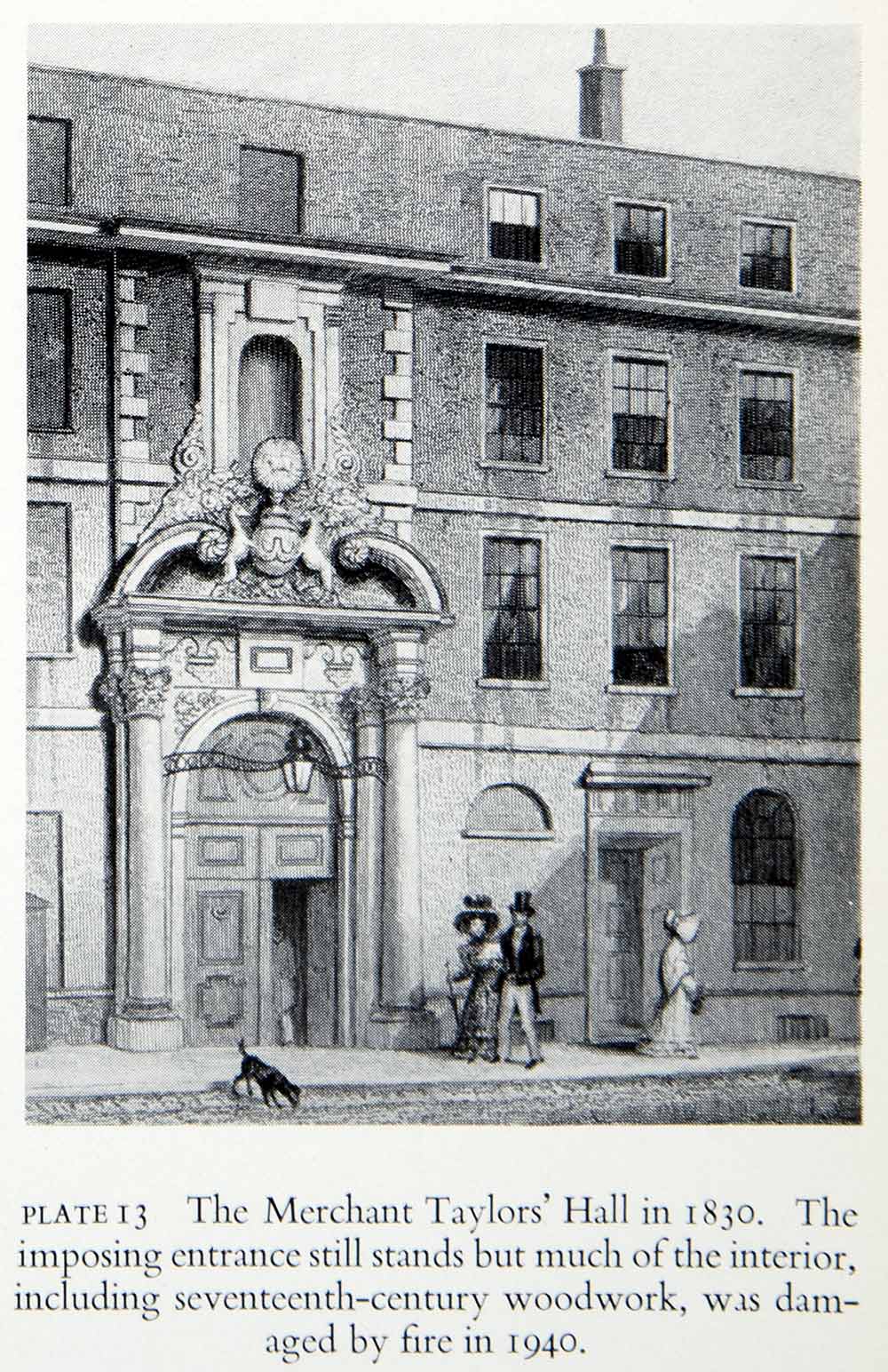 This is an original 1951 black and white halftone print of the Merchant Taylors' Hall which is located between Threadneedle Street and Cornhill in London, England. It has been the seat of the Worshipful Company of Merchant Taylors, one of the Twelve Great Livery Companies of the City of London, since 1347.