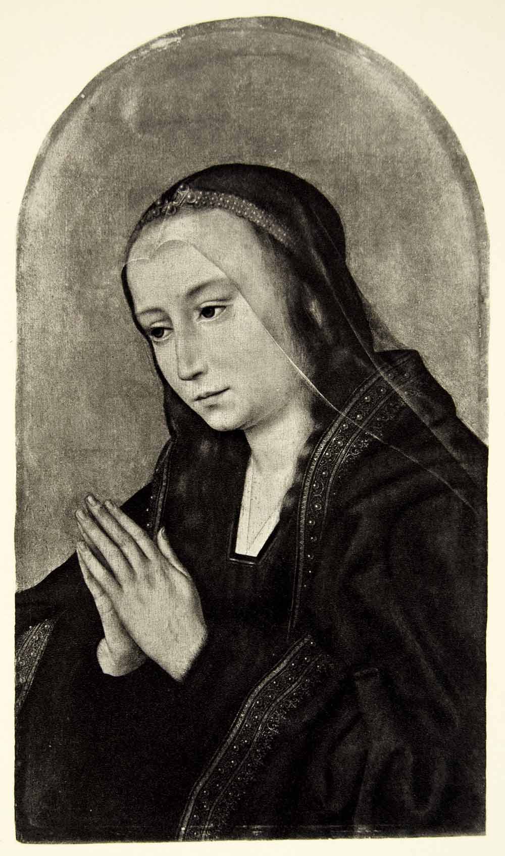 This is an original 1951 monochrome rotogravure of the Virgin of Nazareth praying.