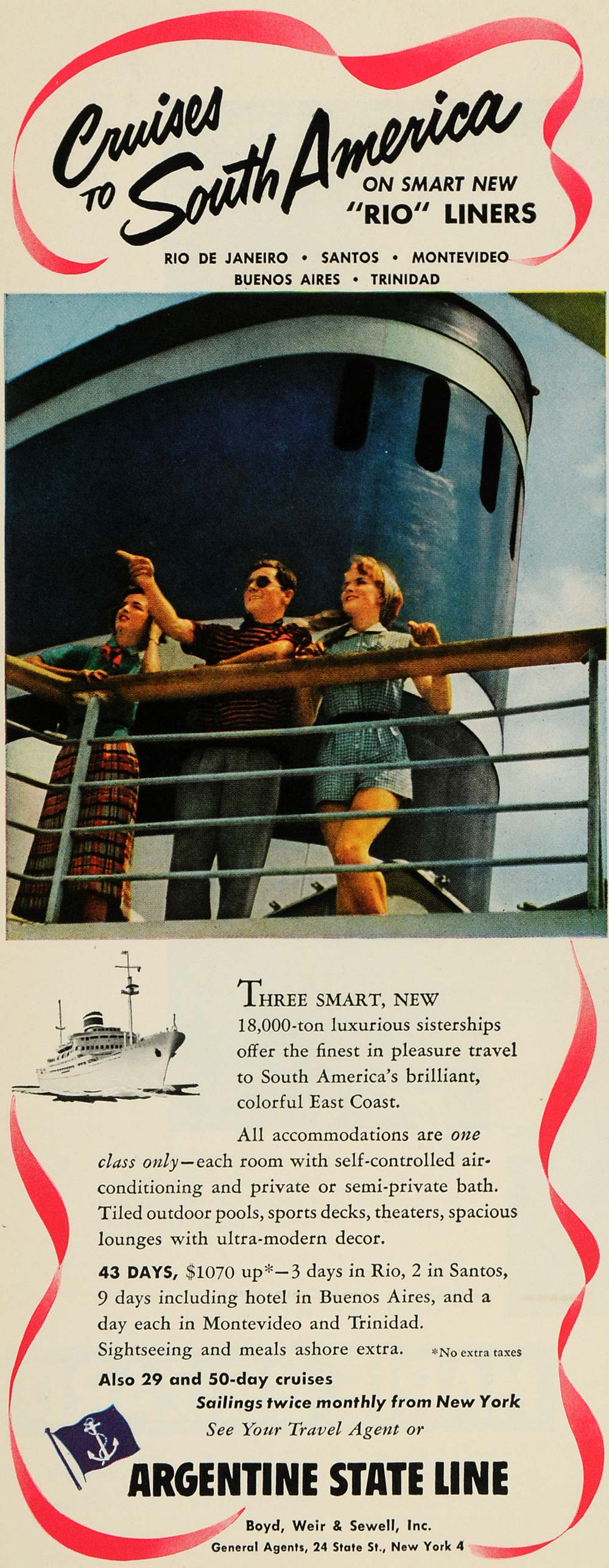 This is an original 1952 color print ad for cruises to South America on smart new "Rio" Liners by Argentine State Line. Their general agents are Boyd, Weir & Sewell, Inc., located at 24 State Street, New York City.