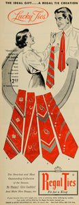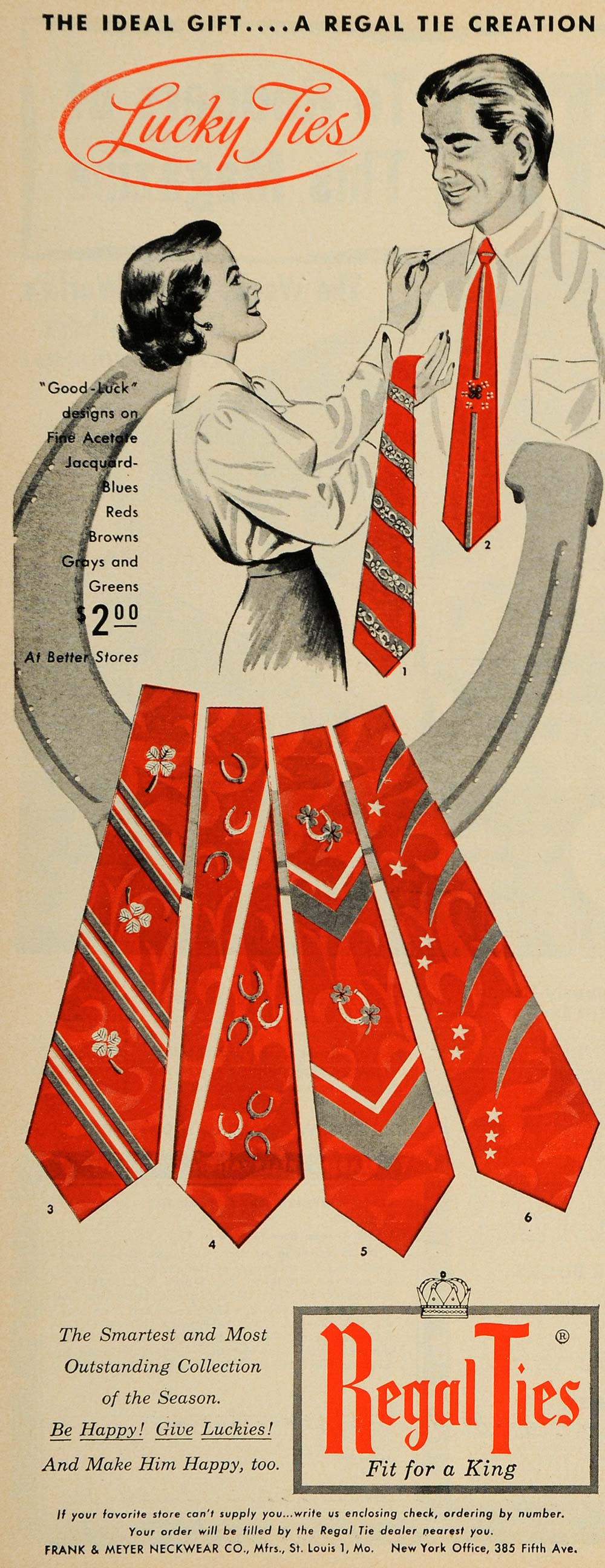 Keywords specific to this image: Vintage Advertising, Business Attire, Clothing Accessories, Four Leaf Clover Ties, Horseshoe Ties, Stars and Stripes Ties, Businessman, 385 Fifth Avenue New York, Mesnwear, Prcing, Acetate Jacquard Styles, Horse Shoe, Men's Fashion