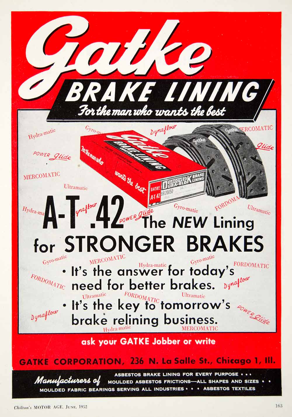 This is an original 1952 two-color print ad for Gatke Brake Lining from the Gatke Corporation, located at 236 North La Salle Street, Chicago, Illinois.
