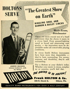 This is an original 1952 black and white print ad for Frank Holton & Company of 330 N. Church Street in Elkhorn, Wisconsin, featuring Andrew Grainger, the trombonist for the bandmaster Merle Evans (of the Ringling Brothers and Barnum & Bailey Circus).