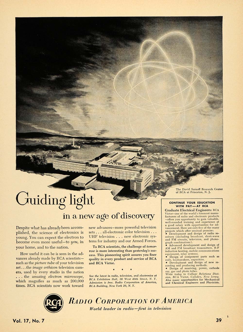 This is an original 1952 black and white print ad for the Radio Corporation of America (RCA), located in New York. This ad features the David Sarnoff Research Center of RCA Victor at Princeton, New Jersey.