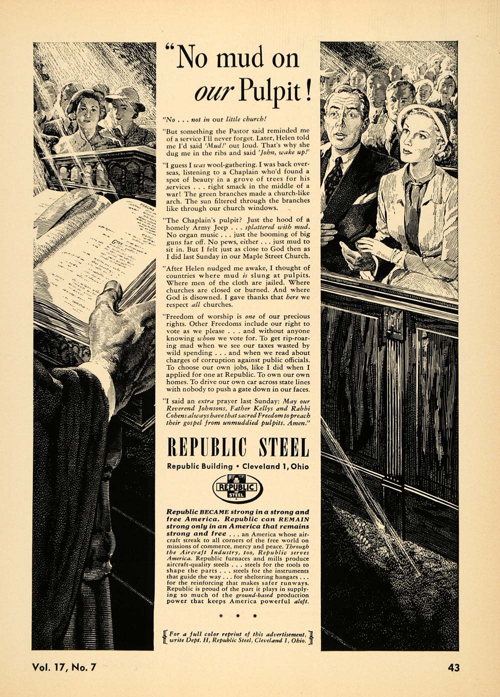 This is an original 1952 black and white print ad for Republic Steel, located in the Republic Building in Cleveland, Ohio. This ad features their aid in the aircraft industry and an image of some listening churchgoers.