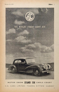 This is an original 1952 black and white print ad for the AC Light Six automobile from A. C. Cars Limited, Thames Ditton, Surrey, England.