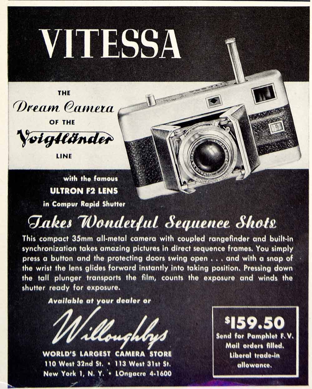 This is an original 1952 black and white print ad for Vitessa, featuring the Dream Camera of the Voigtlander Line, which includes the famous Ultron F2 Lens.