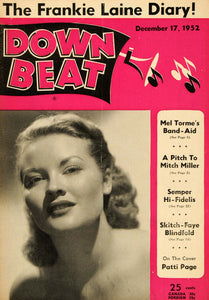This is an original 1952 color cover for Down Beat Magazine for December 17th; this cover features Patti Page (Clara Ann Fowler), the female American pop vocalist and singer, the performer of "Tennessee Waltz".CONDITION