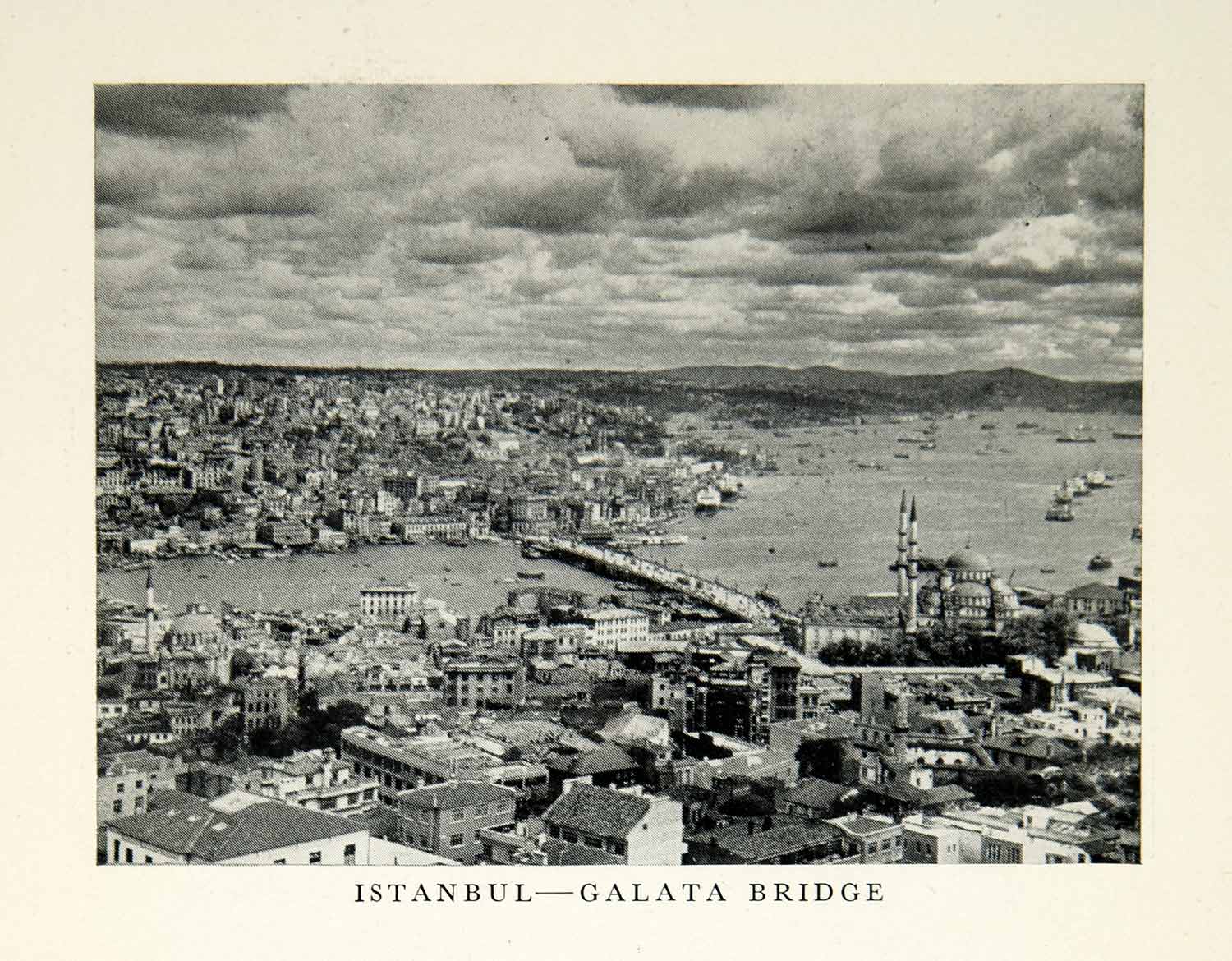 This is an original 1952 monochrome halftone print of the Galata Bridge in Istanbul, Turkey.