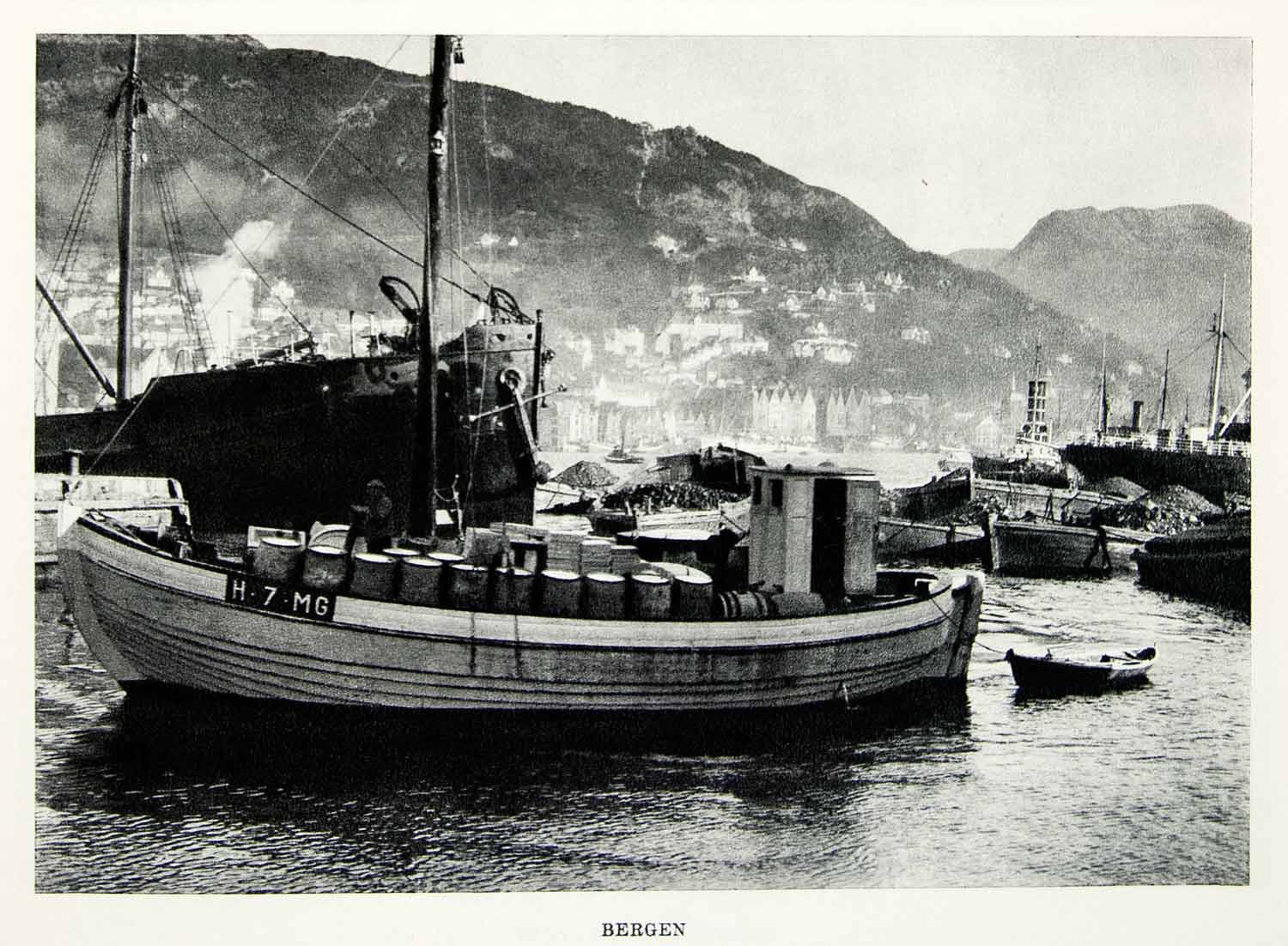 This is an original 1952 black and white rotogravure of the city of Bergen, Norway along the waters of the Byfjorden.