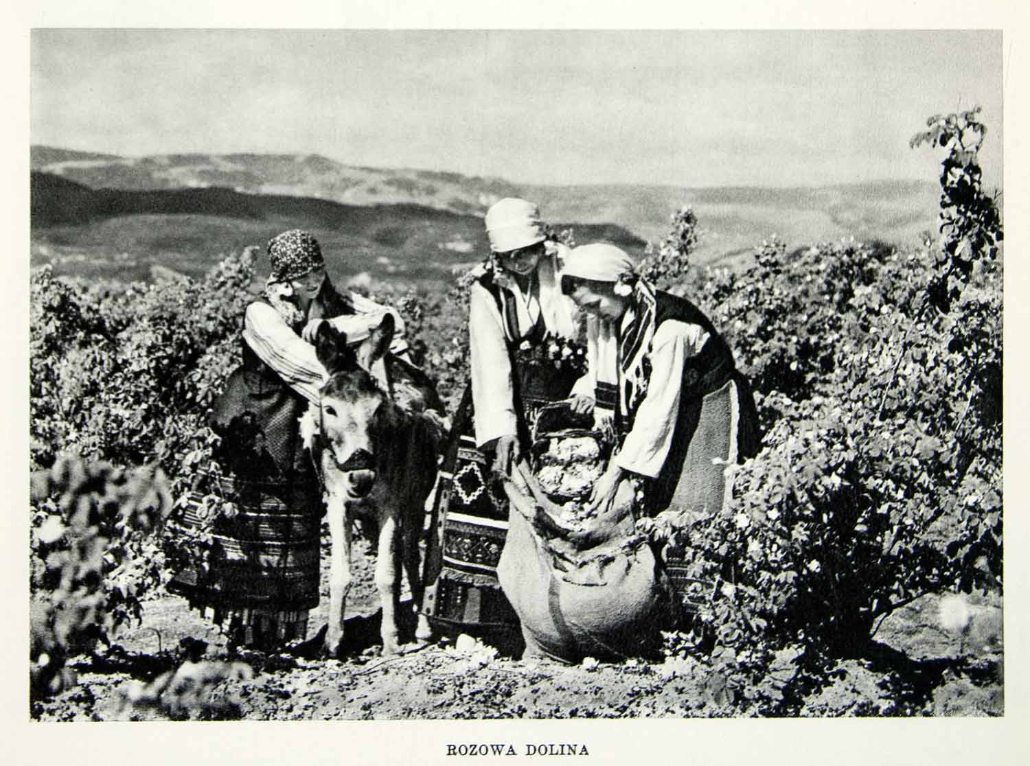 This is an original 1952 black and white rotogravure of women harvesting in the fields near the village of Dolina, Bulgaria.