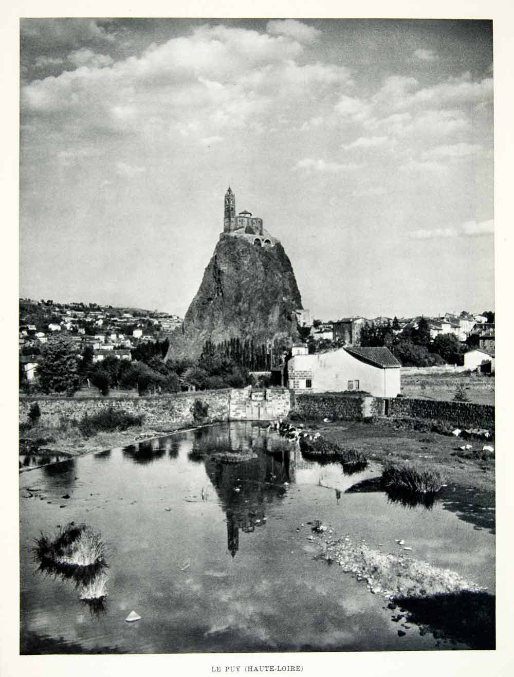 This is an original 1952 black and white rotogravure of the city of Le Puy, France that is situated along the Loire River. The Chapel of Saint Michel d'Aiguilhe can be seen precariously perched atop a volcanic rock formation. Two hundred and sixty-eight steps carved into the rock allow pilgrims to reach the chapels entrance. It would suck to be the mailman for that place.