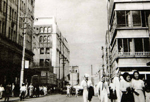 This is an original 1952 black and white rotogravure set of Yokohama, Japan. The city can be seen in the first image, laid out in front of the nearby Nogeyama Park. In the second, pedestrians line the busy street of Isezakicho. Three foreign sailors stroll behind two smiling Japanese natives. Please be sure to view the additional image.