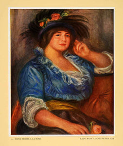 1952 Tipped-In Print Jeune Femme la Rose Lady Hat Portrait Renoir Woman XAG4