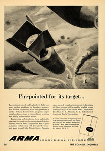 This is an original 1953 black and white print ad for the Arma Corporation of 254 36th Street in Brooklyn, New York. This ad features their advanced electronics and engineering for mechanical and machinery control, including missiles.