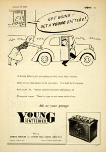This is an original 1953 black and white print ad for Young car batteries that were made and sold by Crompton Parkinson Ltd. of Crompton House, Aldwych, London, England, United Kingdom.