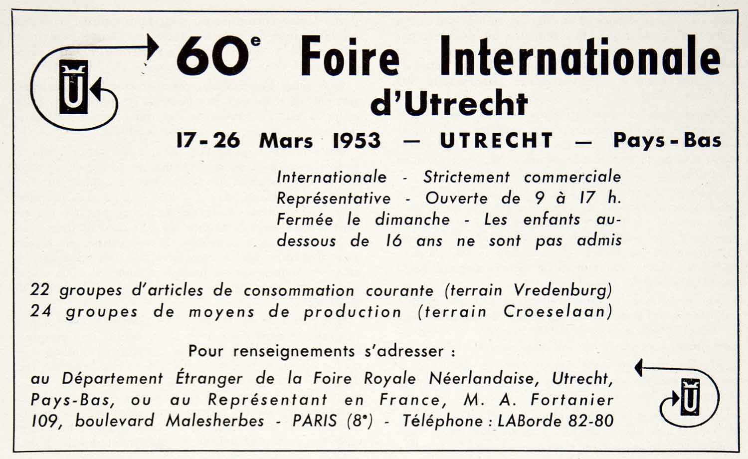 This is an original 1953 black and white print ad for the 60th International Fair of Utrecht.