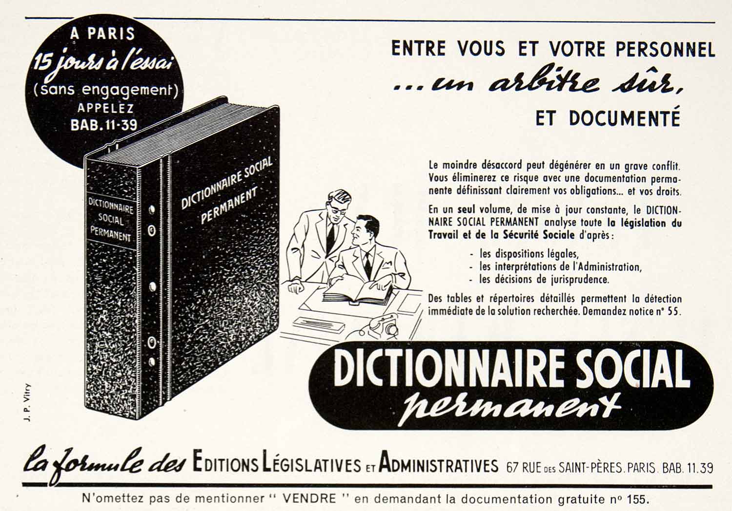 This is an original 1953 black and white print ad for the Dictionaire Social Permanent, a handy training tool and resource for any business owner.
