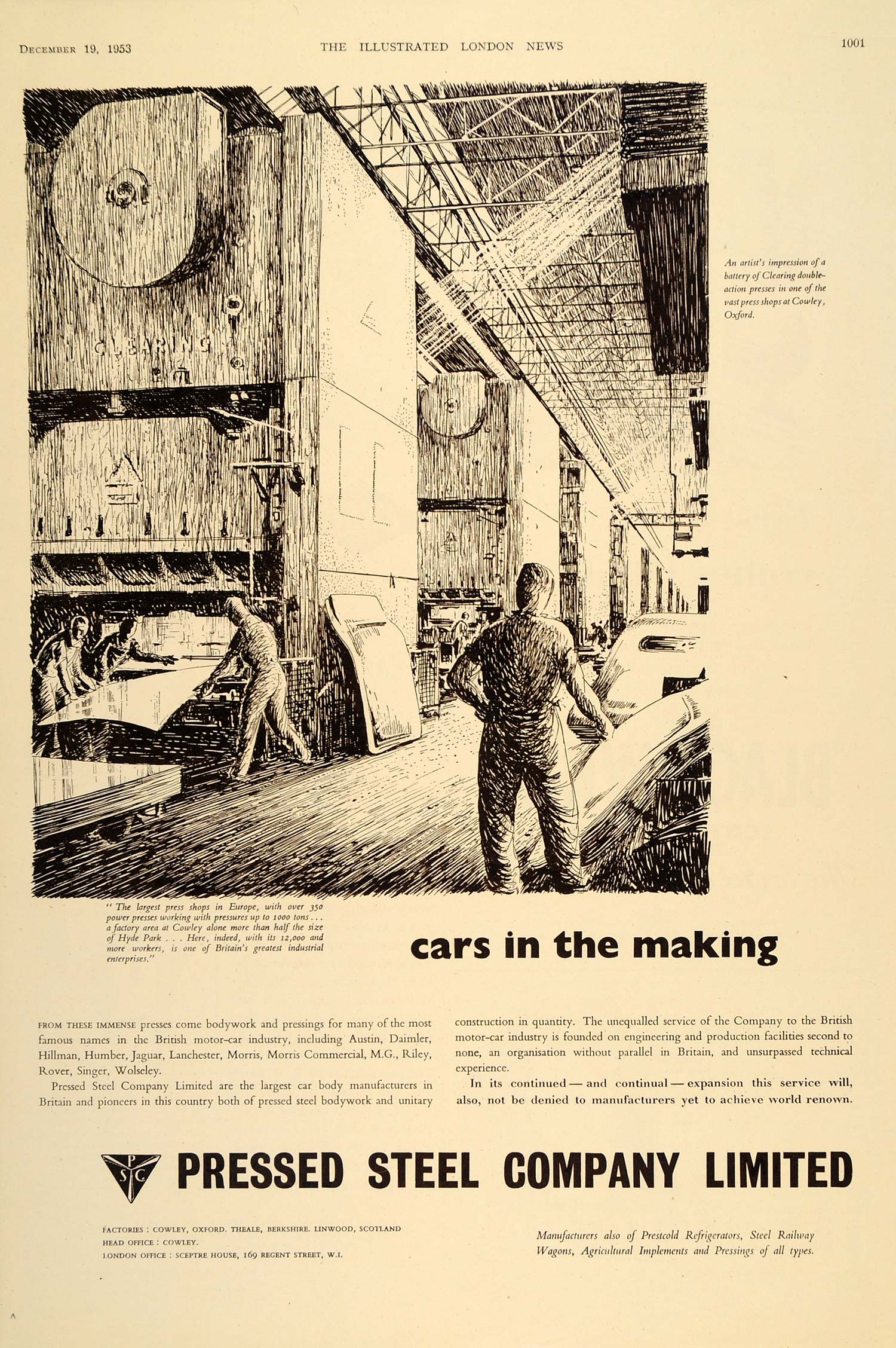 This is an original 1953 black and white print ad for the Pressed Steel Company Ltd. with an illustration of a battery of Clearing double-action presses in one of the press shops at Cowley, Oxford, England.