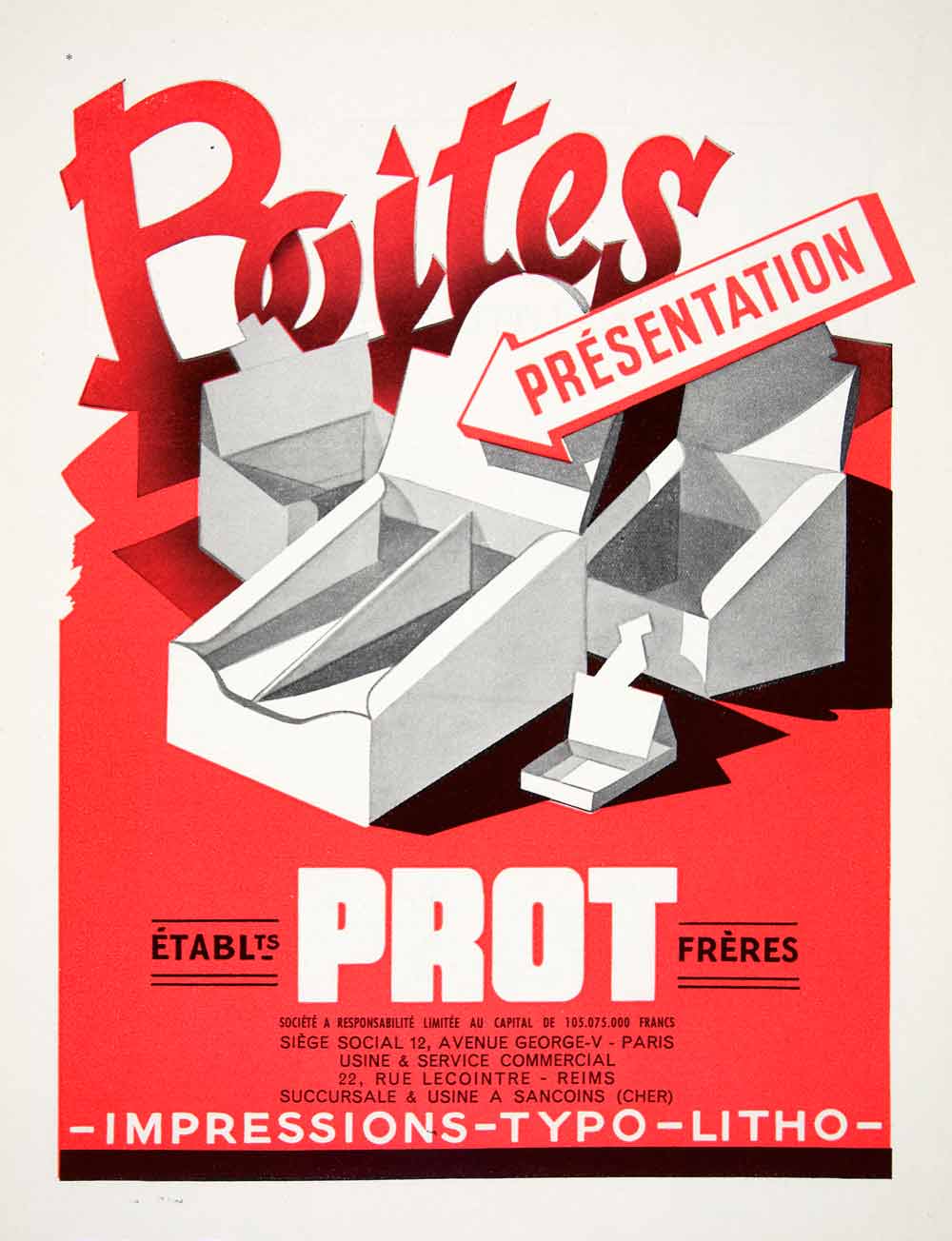 This is an original 1953 two-color print ad for the creative box displays from the Prot Frères, whose headquarters were located at 12 Avenue George-V, Paris.