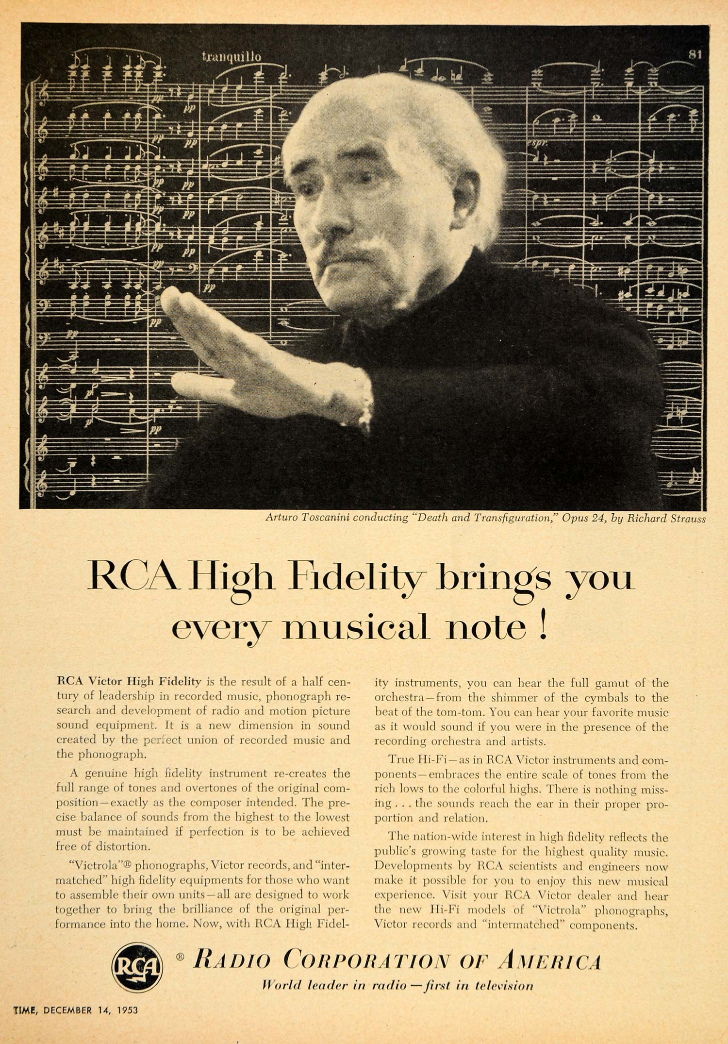 This is an original 1953 black and white print ad for RCA Victor High Fidelity from the Radio Corporation of America located in New York. Maestro Arturo Toscanini is conduction Death and Transfiguration in this ad.