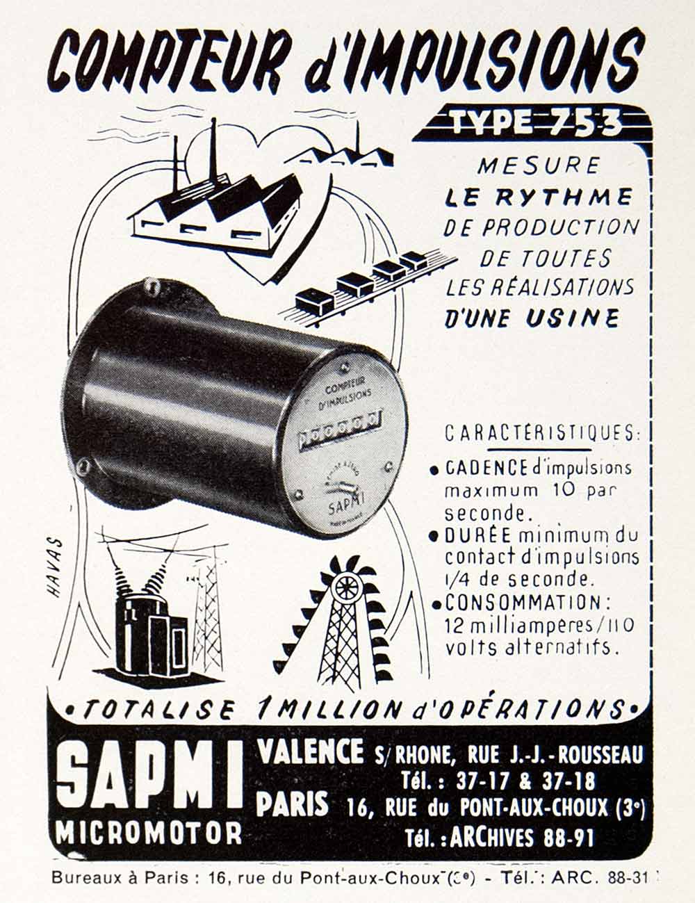 This is an original 1953 black and white print ad for the SAPMI Micromotor counter.