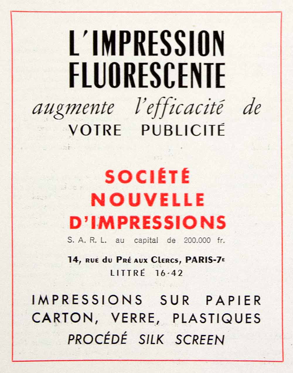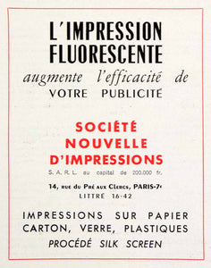 This is an original 1953 two-color print ad for the silk screening services of the Société Nouvelle D'Impressions, located at 14 Rue du Pré aux Clercs, Paris. They also specialized in fluorescent printing.
