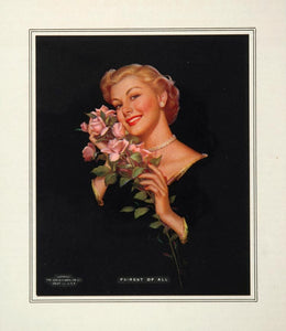This is an original hand tipped-in print of a lovely woman in a black dress with a bouquet of pink roses. The print can be easily removed for framing.