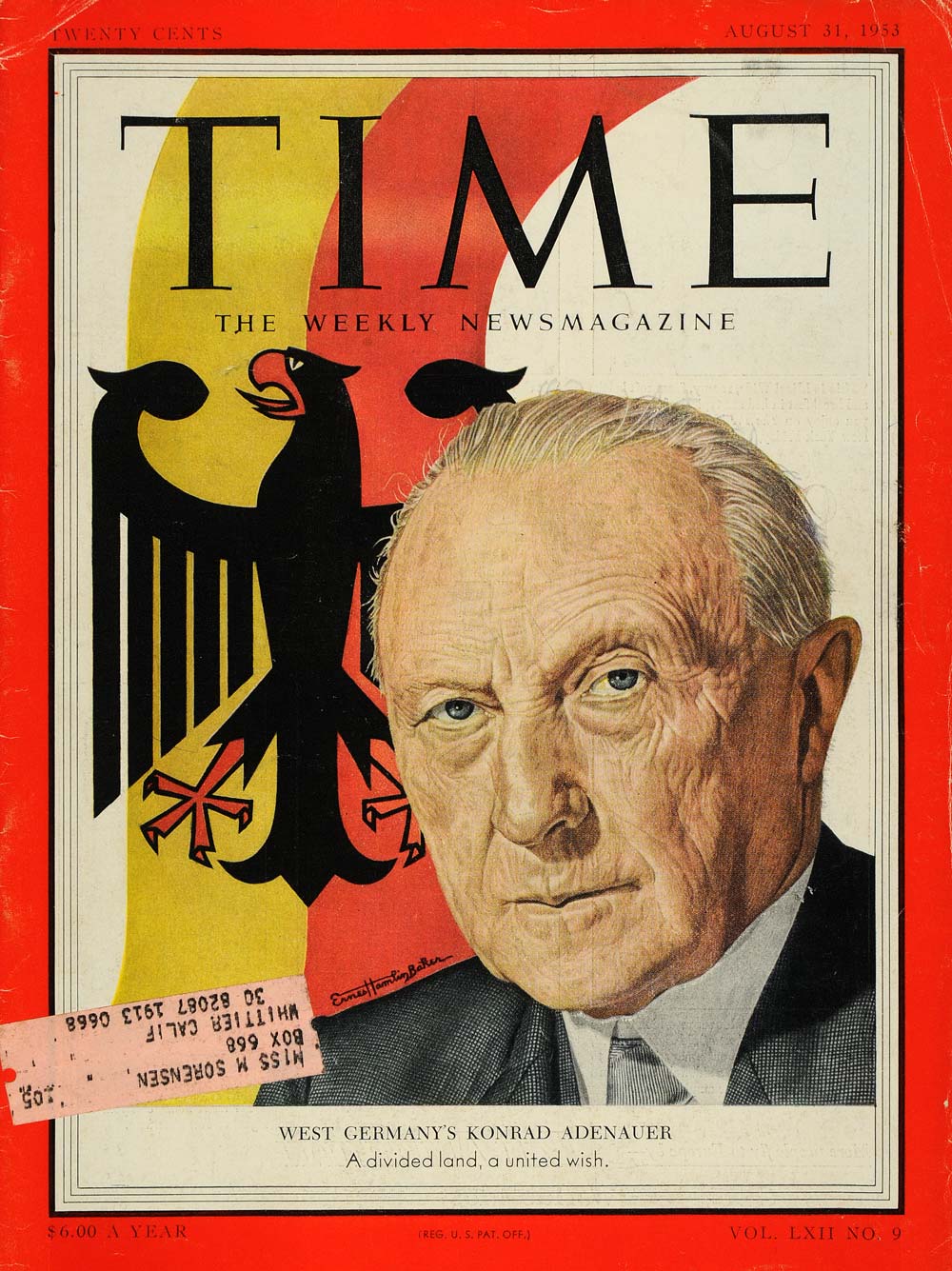 This is an original 1953 color cover for the Time Weekly Newsmagazine featuring an illustration of Konrad Hermann Joseph Adenauer, the first chancellor of the Federal Republic of Germany, called West Germany, dated August 31, 1953, Vol. LXII, no. 9.CONDITION