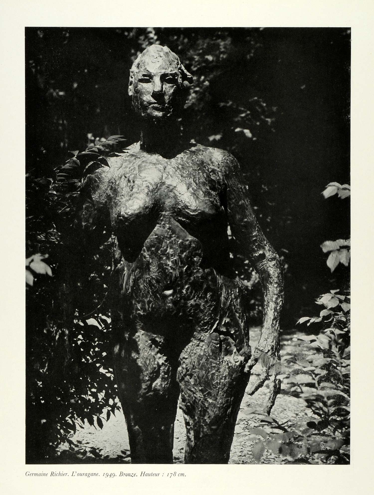 This is an original 1953 halftone print (with French caption) of a statue by Germaine Richier. Richier was a French sculptor who often depicted human-animal hybrids and people in anguish.